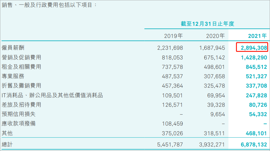 我们查看蔚来对应的薪酬,2021年研发雇员薪酬26.58亿元,销售、一般及行政雇员薪酬为28.94亿元。